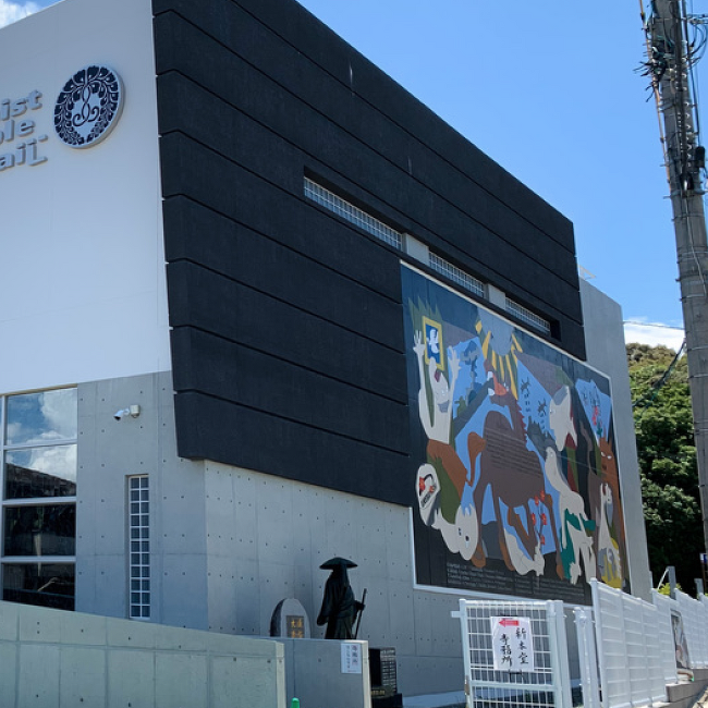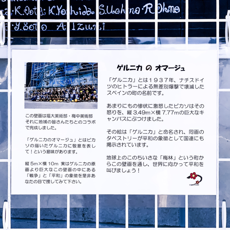 『梅香る町プロジェクト#02』梅林中学校美術部と福岡大学美術部の共同制作ですばらしい壁画が完成しました。ピカソのゲルニカのオマージュ作品で、世界各地で今もなお続いてる戦争に対して絵画で反戦を表現したものです。