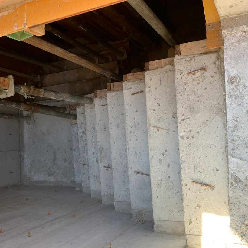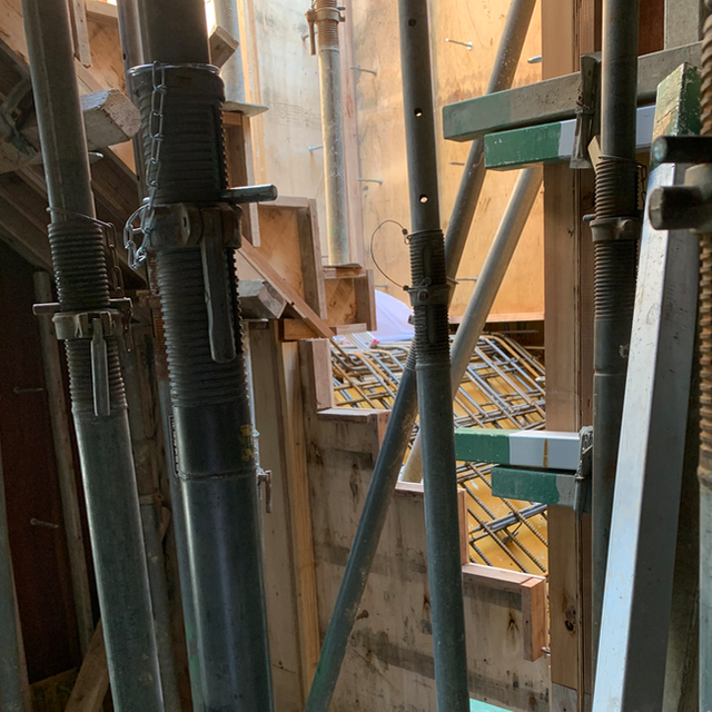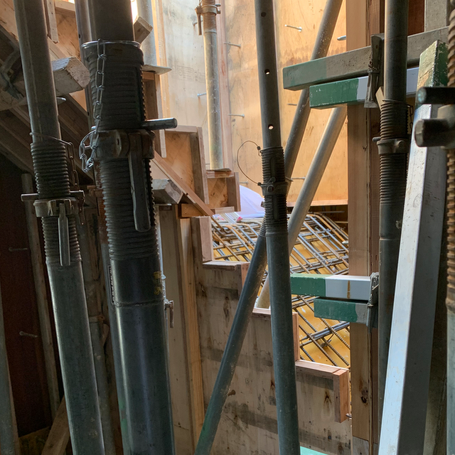 お寺のエリアと庫裡部分を結ぶ階段。RC造で2カ所の踊り場がある究極のまわり階段。なにが究極かというと、階段下はWCとボンベ置き場のスペースをとるため空中に浮いた形ではね出しかつ梁から吊り下げた壁に支えられた構造で、なかなかのアクロバティックさ。実際施工可能なのかと疑心暗鬼ですすめた部分。型枠、鉄筋、コンクリート打設とかなり複雑な施工だったが、ハイレベルな職人技で見事に完成。出来上がりを見て感慨ひとしお。