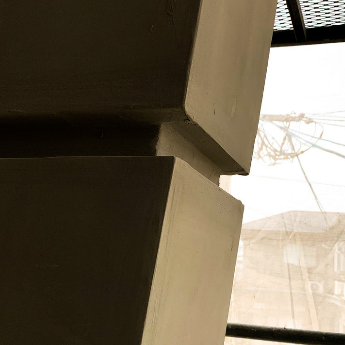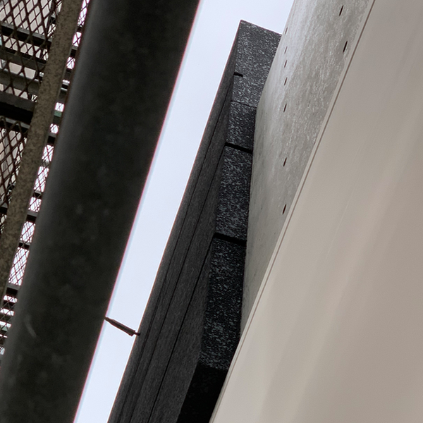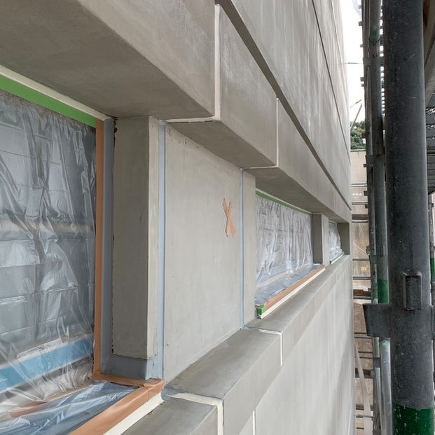 吹き付け仕上げの外壁(化粧目地入り)一般壁の増し打ちは15mm、吹き付け部分は115mm。その段差は100mmで横ラインの化粧目地は見付け40mm深さ30mm。途中部分に設けた横長スリット状の部分はサッシと打ち放し壁。サッシは躯体芯合わせで見込みが115mmでかなりの深さで、打ち放し部分も一般壁で段差が100mmで陰影がはっきりとした横スリットとなった。