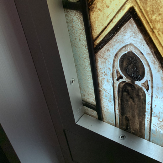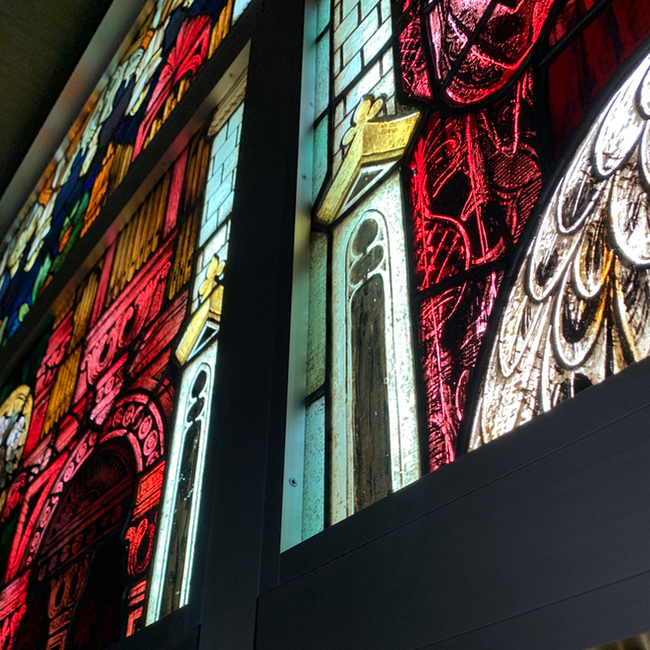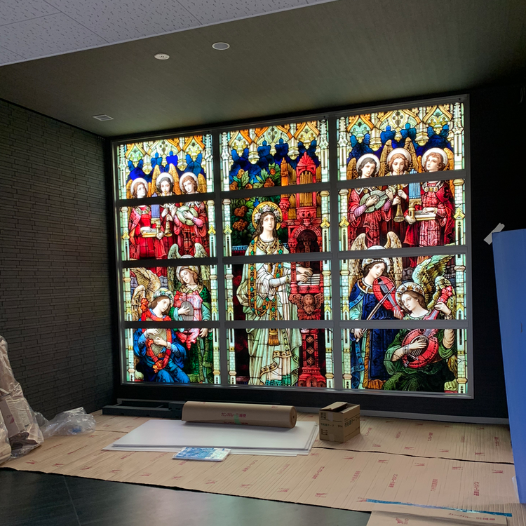 納骨室のホールに設置されたマリア像のステンドグラスは住職がヨーロッパで買い付けてきた古くは中世の教会に設置されていたものです。大きさに合わせて開口部を決めカーテンウォールの割付をしています。本物のステンドグラスは鉛で縁取りをしているため自重がかなりありそれをビス固定するので、方立や無目はかなりしっかりとしたサイズ感になりました。また、北面から入る光は安定した光量でステンドグラスはいつも明るくホールを照らしてくれます。