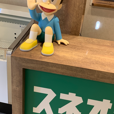 樹脂製フィギュア幅25cm奥行25cm高さ40cm。けっこうデカいし重い(ウン万円)。カウンター横に座って招いてくれます。