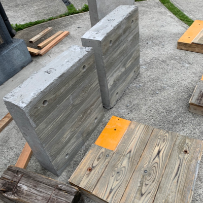杉板型枠の表現方法として2種類の型枠を準備。「浮造り」という板材の木目をしっかり出すため表面を削ったものと加工なしの自然の木目を表現したそのままの杉板を使ったもの。比較してみると、浮造りの方は木目が強調されすぎた感じだったため不採用となった。