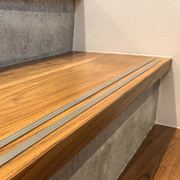 無垢材の固定はノンスリップの溝を利用し合板に隠し釘留め。 ノンスリップは8mm角ステンレス鋼ダブルを無垢材に溝を掘り埋め込んだ。1mm突起のすべり止め。 ステン鋼の表面すべり止めエッチング加工は今回せず。