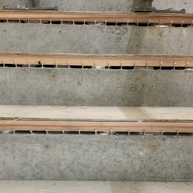 踏み板は根太+合板下地、蹴上はモルタル。それぞれ仕上げしろを含んだ寸法のコンクリート躯体。 モルタルの剥がれクラック対策で蹴上の上部に均等に釘打ちし剥離防止を図った。 仕上げはコンクリート打ち放し補修。