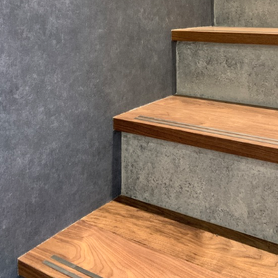 階段は音や振動を考慮し、躯体はコンクリート造とし、踏み板は30mm厚のウォールナット無垢材。 蹴上やケラバ側面はコンクリート素地(打ち放し仕上げモルタル)