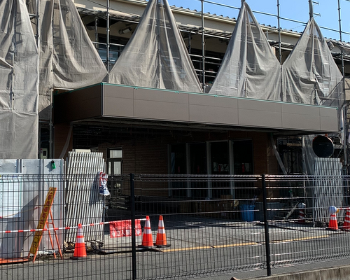 既存の園舎も使いながら仮設園舎も稼働中。厨房では給食をつくって配食...
