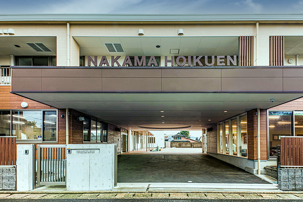 この保育園のメインエントランス、おおきな庇のかかったピロティ空間で...