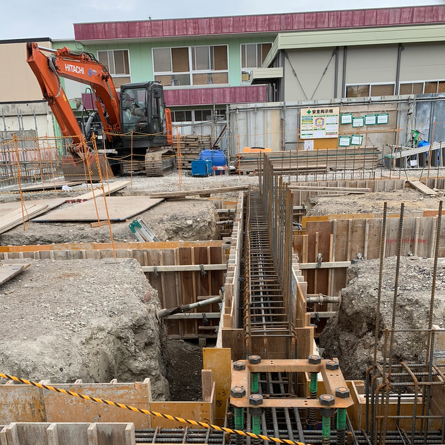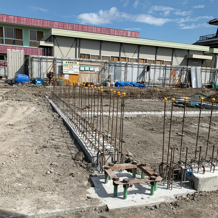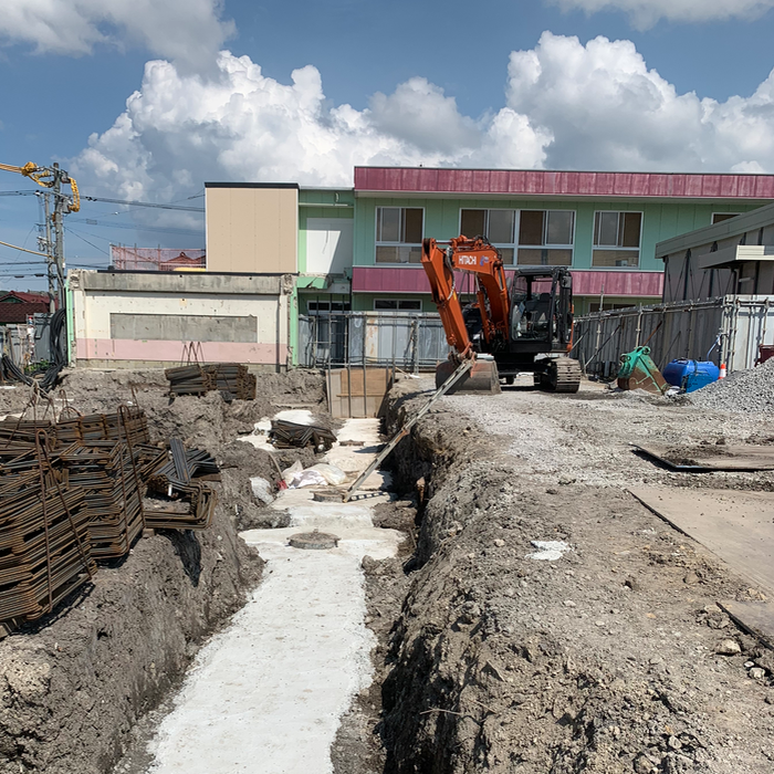 既存の園舎も使いながら仮設園舎も稼働中。厨房では給食をつくって配食。園児はお昼寝。危険回避騒音注意防災厳守。