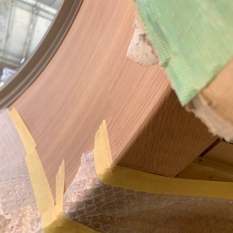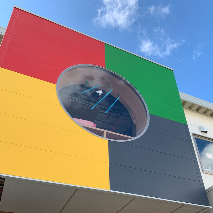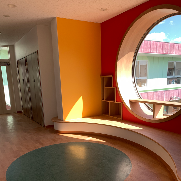 廊下から1m程突き出たアルコーブ状のスペース『えほんコーナー』です。半円状のベンチは座ると自然と中心に向かうような形で、横に並んで座っても向かいあいやすくなります。座面も低いので床に座ると背もたれにもなります。また半径1メートルの透明強化ガラスを使った円形窓は、2階から運動場を一望でき空からの光もたくさん入ってくる大きな窓です。曲面の窓枠も集成の「座れるベンチ」として計画しましたが、残念ながら高さの恐怖感がまさってしまい補強を兼ねた飾り棚の設置となりました。