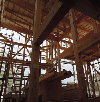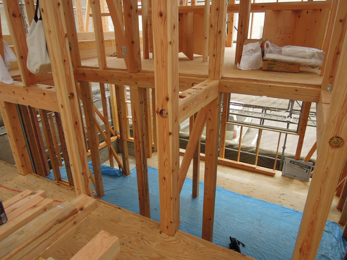 スキップフロアのG邸。今日は審査機関の中間検査でした。一階から見上げる中2階のリビング。ちょっとした工場的な大空間です。