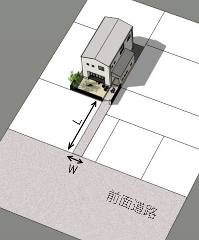「敷地が道路に接していること」 家を建てるにはある一定の条件が満たされていないと建てることはできません。その条件の中に「敷地が道路に接していること」というものがあります。 大きな土地があって、それを宅地として分譲する場合、ある程度売りやすい大きさに土地を分割するわけですが、その時どうしても道路から奥まったところの土地が余ってしまいます。そんな場合どうするのでしょうか?住宅用地は道路に接していなければならないので、敷地を細長く道路まで延長させて接道条件を満たします。これが「旗ざお系の敷地」です。このような土地は地価が安く手に入るので魅力的かもしれませんが、反面、それなりに気をつけておかなければならない事もたくさんあります。一番大事なのは上述の接道条件です。これが満たされてなければ家を建てることすらできません。特に基準法上では幅員2mが限度となっていますが、地域によっては、Lの長さによってWが3m必要だったり、建物の防火性能を要求されたりと、建てる地域によって条件が違ってくるため、条例などの確認が必要になります。!(ちなみにここ北九州ではこのような特例はないとのことです。H23/7現在)また、道路と接する部分で2m確保できたとしても、中間部分で通路が2m幅なければ、接道条件を満たすことができません。土地購入の際はこれらの項目はぜひともご確認を!! また、実際の生活についても注意点があります。まず奥まった土地ということは、ほとんどの場合周囲を家でとり囲まれることになります。この場合は中庭形式にしたり天窓を設けるなどにより、自然光や通風の確保、プライバシーの確保が必要となります。さらに駐車スペースの問題もあります。奥のスペースで確保できる分には構いませんが通路部分を駐車スペースにするには、ある程度の幅が必要になってきます。2m幅ではまず引越しが大変になりますし、軽自動車でも1.4m幅なので、乗り降りすら厳しいでしょう。塀を建てることを考えれば、3m幅は欲しいところでしょうか。 また施工上でも重機の乗り入れができなかったり、資材の搬入で手間がかかったりと、工事費にはねかえってくる場合もあるので、土地が安いからといって飛びつく前に、このような土地の場合は事前に設計者に相談されることをお勧めします。
