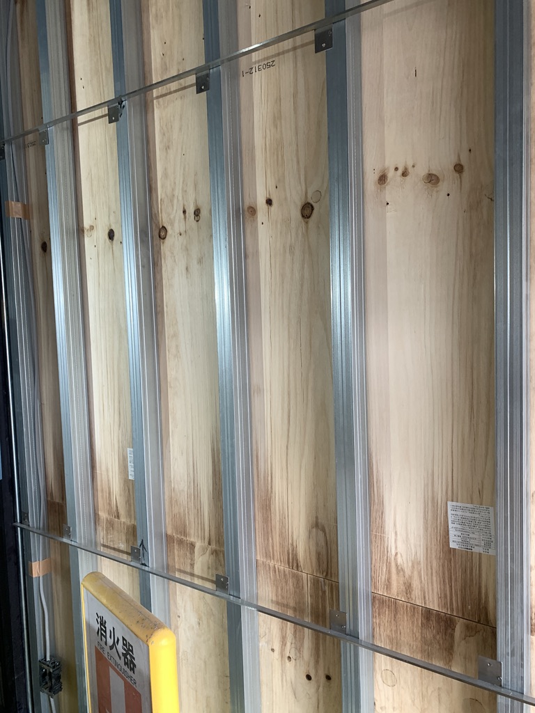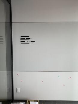 掲示範囲を示すため上下アルミFBで見切りをいれ、 間にマグネットボードを施工。 仕上げはビニルクロス貼りで壁同柄の色違い。 クロスの選定も縛りがないのでそのあたりも良いし 壁と同化したスマートな掲示板となった。