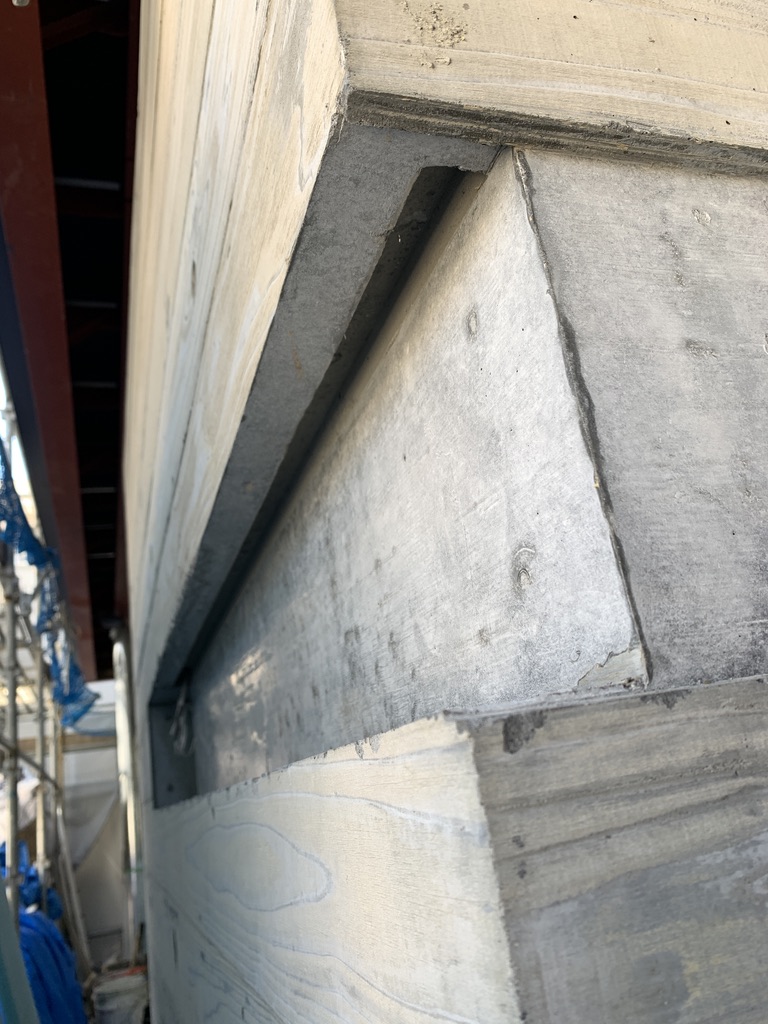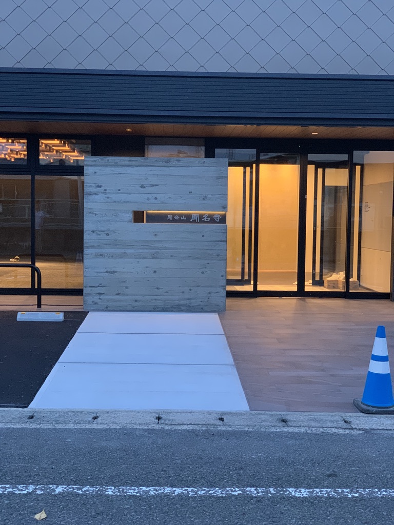 施主要望により館名に間接照明を取り付けたいとのこと。 躯体はRC200mm厚で面落ちしたコンクリート面の上部に 照明がとりつくBOXをつくるという課題。 わずかなスペースで設置可能な照明器具の選定と 可能なまでの躯体欠込みの検討