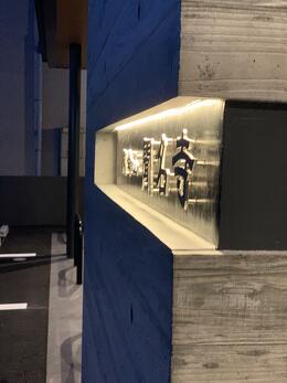 壁は杉板型枠打ち放しコンクリート サイン背部の黒塗装は3分艶 照明器具が映り込まないようにした。 ステン切り文字はブラスト加工 ぼんやりと照らす灯りは 常夜灯としての役割をもつ。