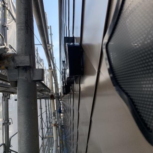 フォントはオリジナル字体による 大きいサインは860×860×60 小さいサインは500×500×60 両方とも壁面から10mm浮かせることで垂れ汚れに配慮 設置位置は電源ケーブルが防水立ち上がりより下になる位置で決定