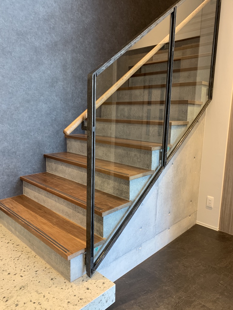 手すりは木製(集成材)ウレタン塗装 受け金物はスチールFBで手すり子のFB×2で挟み込んだデザイン 強化ガラスt10の押さえは上下のみ 手すり端部の引っ掛け防止加工のため 受け金物の形状を小さくする必要があった(今後の課題) 振れ止めは階段RC躯体支持のプレートと連続する手すりによる