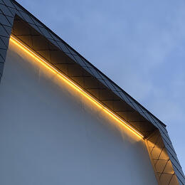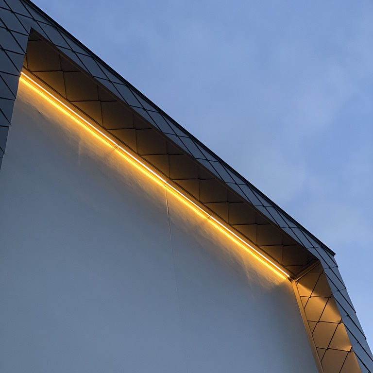 軒天部分の入り隅で菱葺きの押さえを兼ねた板金の照明ボックスを製作 ハゼ部分はかなりの厚みになるためラインを直線に施工する苦労があった 四周に照明をいれたかったところではあるが板金からの漏水を考慮した結果軒部分のみとなった 今後どんな壁画を照らすことになるのか楽しみでもある