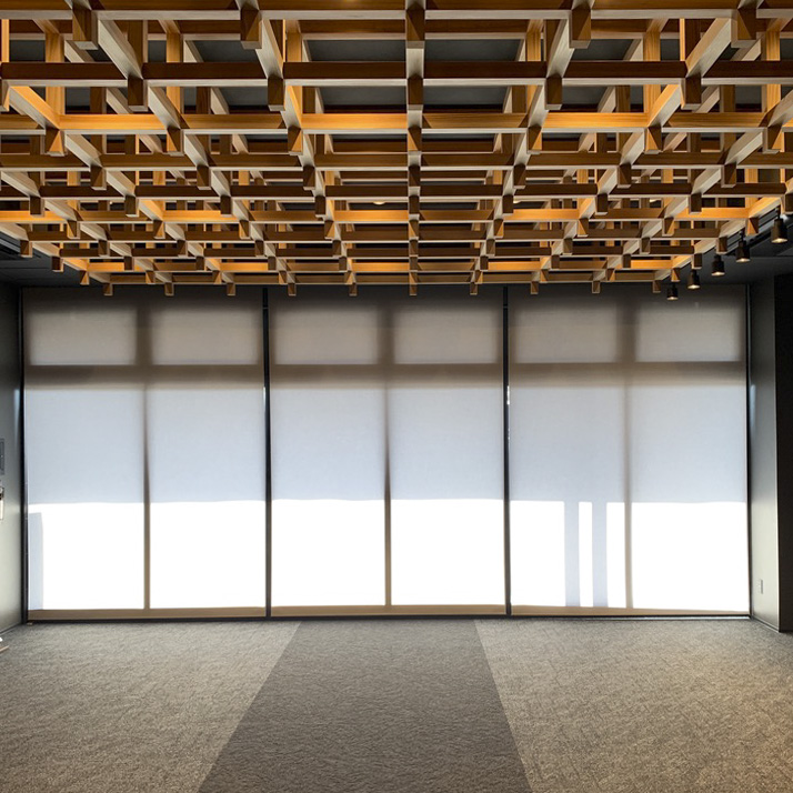 格子の間から漏れる照明の光が天井の陰影を生み立体感を強調する効果でかなり幻想的な仕上がりになった。無垢材の伸縮や反りを考慮し空調を左右の壁際下がり天井に設置したため、折り上げ天井の形となってかえって天井が高く感じられる効果が得られた。