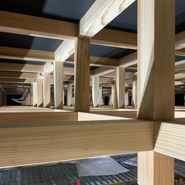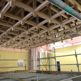 天井の自重が通常より重たくなるため、天井下地は通常の鋼製吊アンカーに木製野縁を直接ボルト留めし下地を形成。木格子部分は現場にてその下地に固定しながら組んでいく施工となった。本体の相欠き接ぎと先端部の隠し釘など見えない部分での仕事は宮大工15人工さすがの技巧。 また地震による横方向変位に対して、野縁を躯体壁面まで延長固定し動きを抑制する工法をとった。