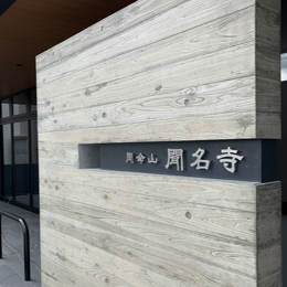 エントランスアプローチの横に立つ高さ2.4mのコンクリートの壁。打ち放し素地に、寺院建築らしさを表現する杉板型枠を採用。目線下の位置に館名サインを配置。 実は既設の如来像(高さ2.4m)が壁の前に移設される予定。像の背景になる壁です。