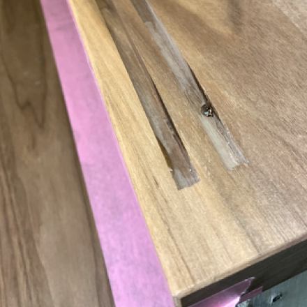 無垢材の固定はノンスリップの溝を利用し合板に隠し釘留め。 ノンスリップは8mm角ステンレス鋼ダブルを無垢材に溝を掘り埋め込んだ。1mm突起のすべり止め。 ステン鋼の表面すべり止めエッチング加工は今回せず。