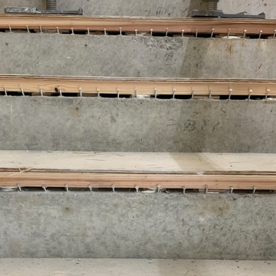 踏み板は根太+合板下地、蹴上はモルタル。それぞれ仕上げしろを含んだ寸法のコンクリート躯体。 モルタルの剥がれクラック対策で蹴上の上部に均等に釘打ちし剥離防止を図った。 仕上げはコンクリート打ち放し補修。