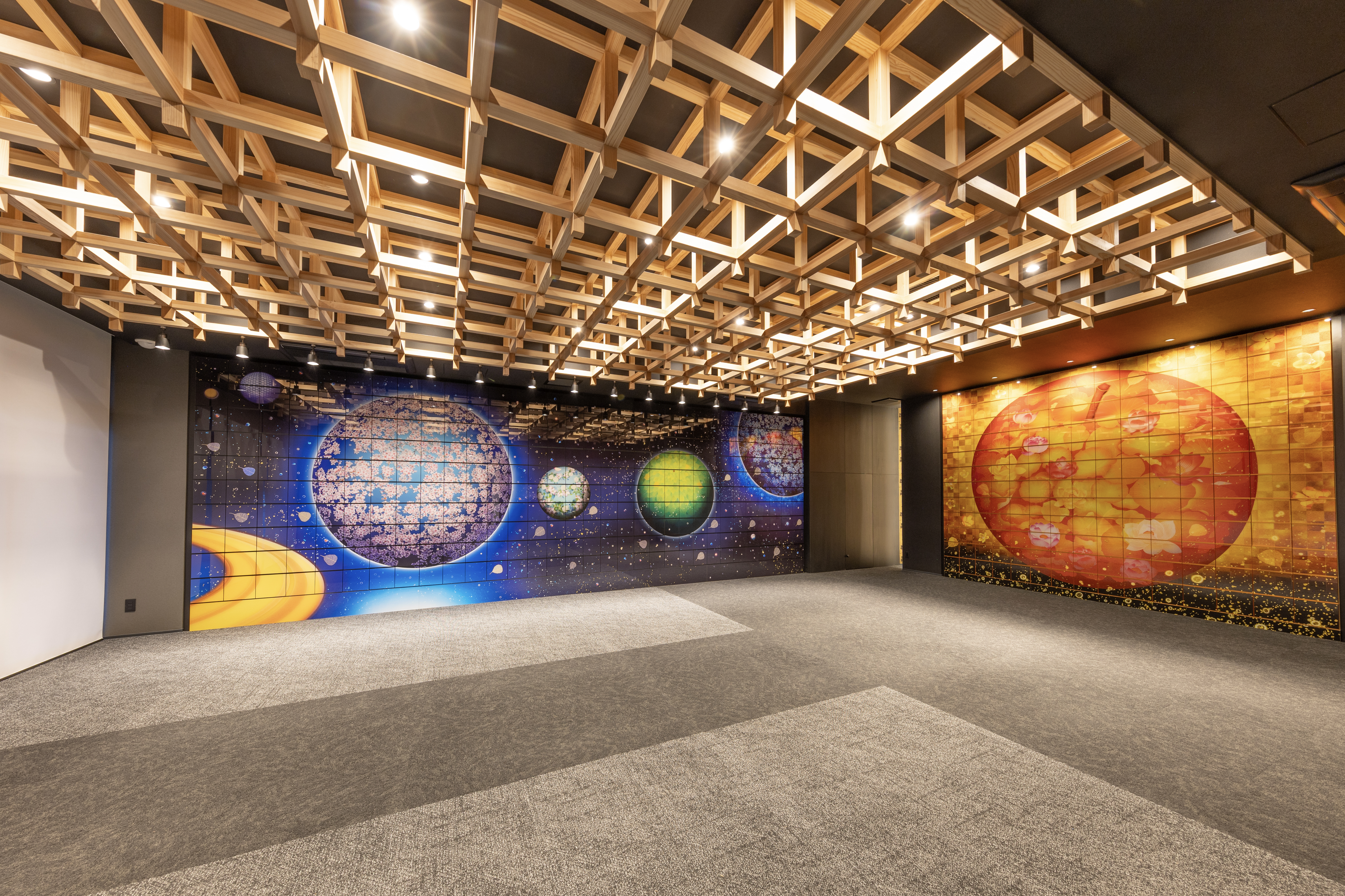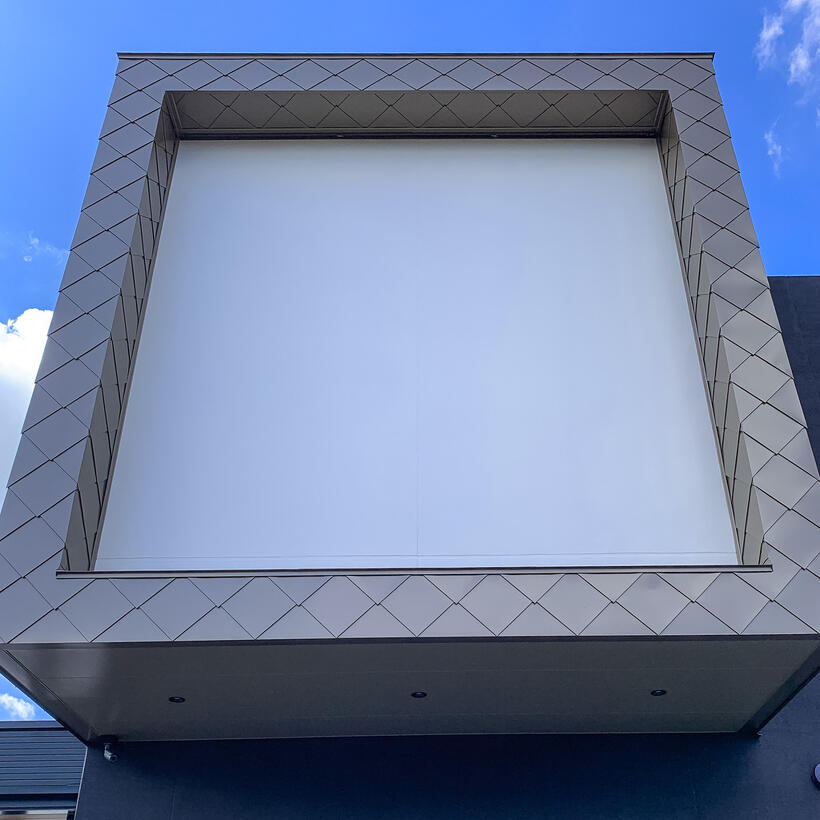 外壁には菱形に葺いた金属板を使い、金絲で織り込まれた和文様の金襴を模した特徴的な壁面としました。光が当たるときらびやかに輝き、影になると落ち着いた渋みが残るピースひとつひとつが様々な表情をみせる印象的な建物となりました。またはね出した端部の壁は4.5m×5mの金色の額に縁取られたキャンバスです。これから企画される「壁画プロジェクト」で、いろんな作家さんがいろんな表現活動を繰り広げるでしょう。