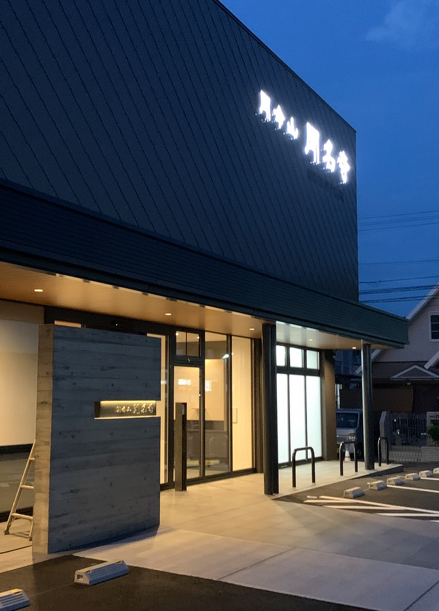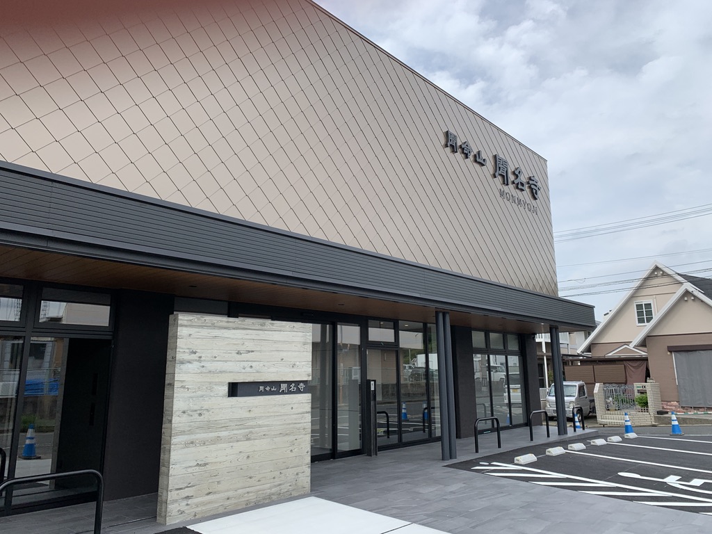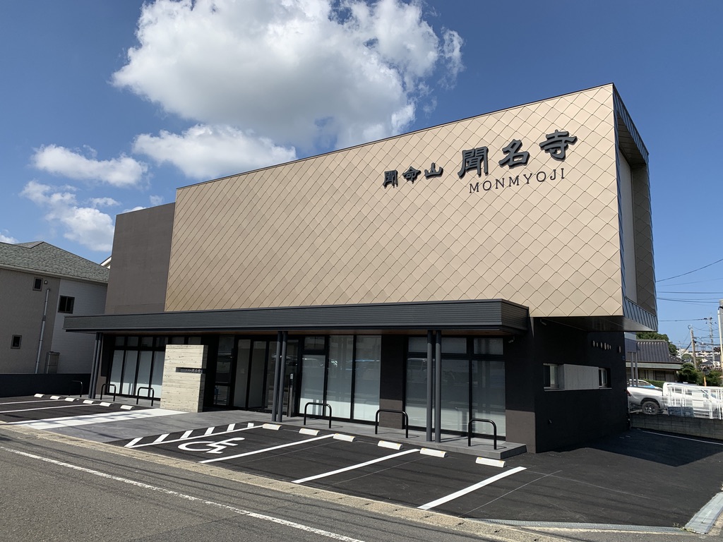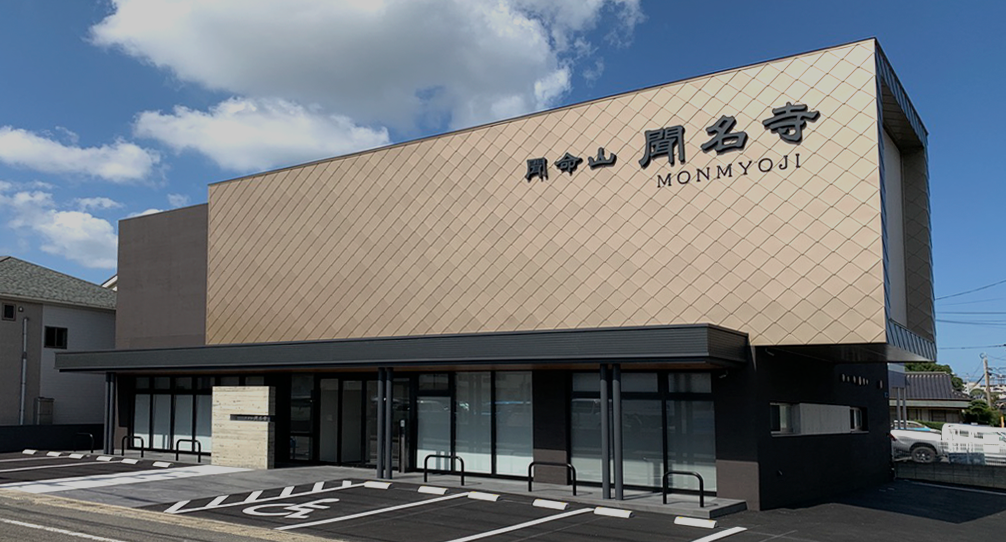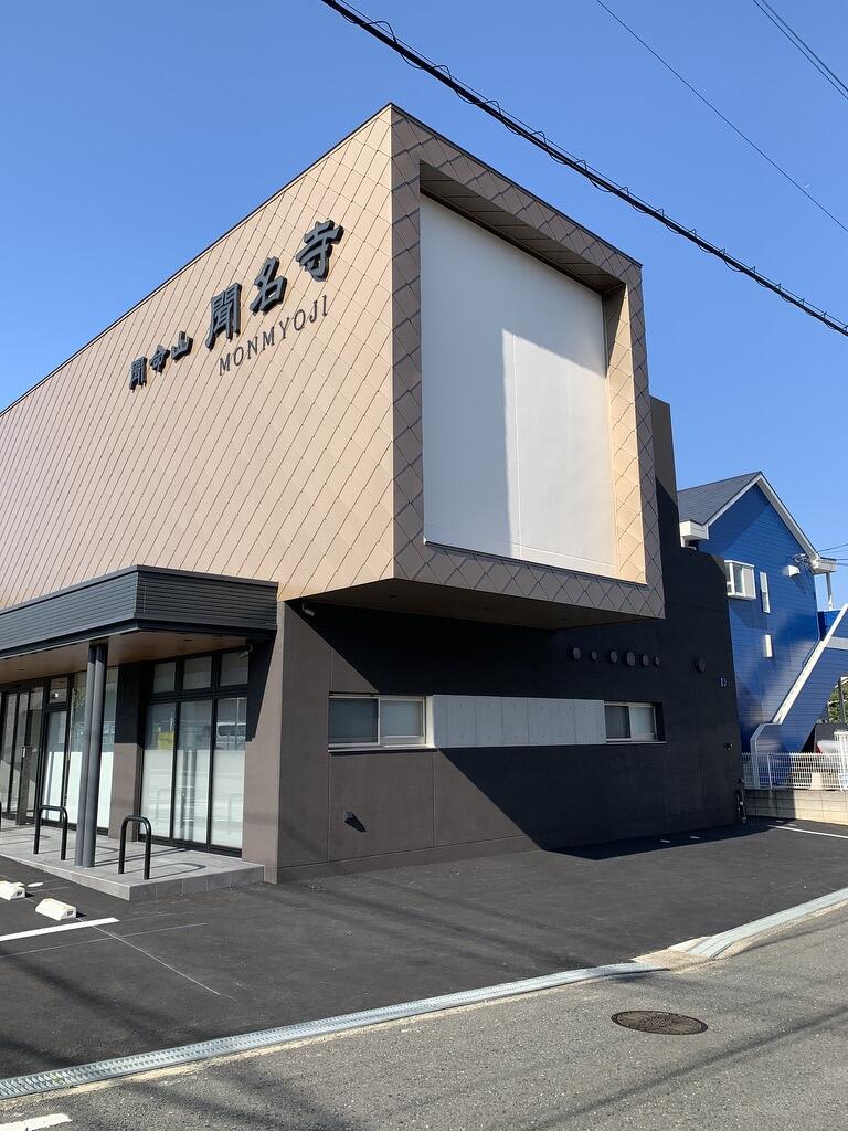 北九州市の八幡西区浅川、閑静な住宅地にある「聞名寺」の本堂の建て替え新築工事。新しい本堂と納骨堂を併設した寺院建築です。新しい時代に合ったお寺のあり方や納骨やお墓の運営の仕方など、新しい試みが多く盛り込まれたお寺です。設計のとりかかりから約2年をかけてようやく完成にたどり着きました。