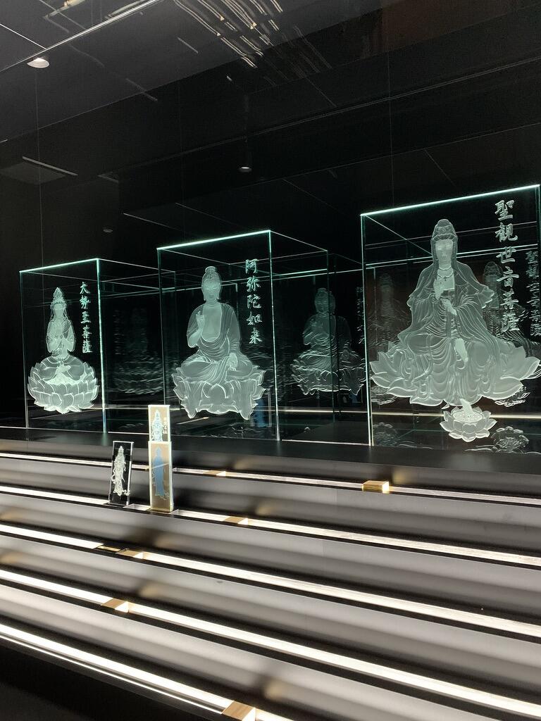 2階にはそれぞれ特徴的な納骨室が3室あります。その中でも「ガラスと鏡と光」で永遠と続く世界観を表現した納骨室はとても印象的。床壁天井を反射する黒で覆われ、納骨されたガラス玉と阿弥陀様が彫られたガラス位牌がさまざまな照明によって照らし出されるとても神秘的な納骨室となっています。