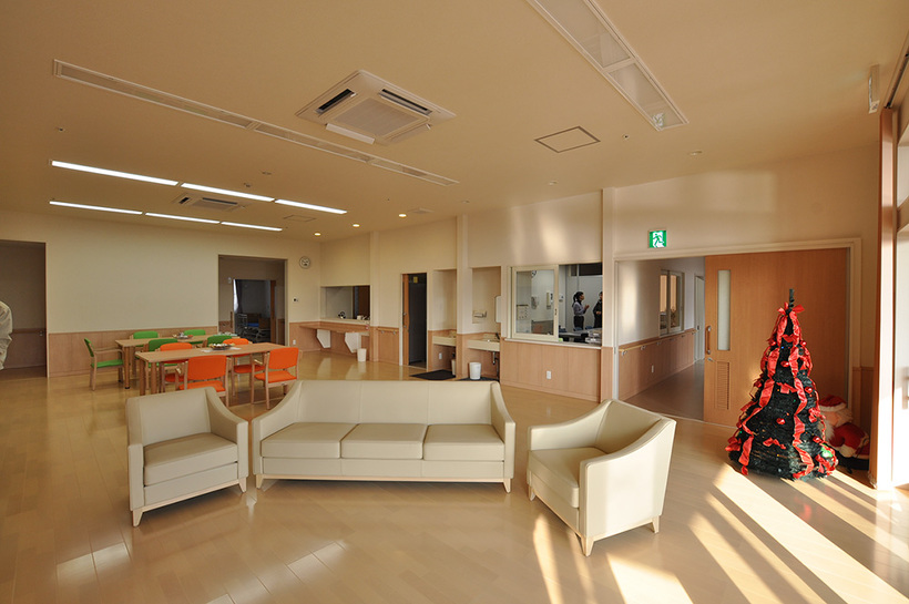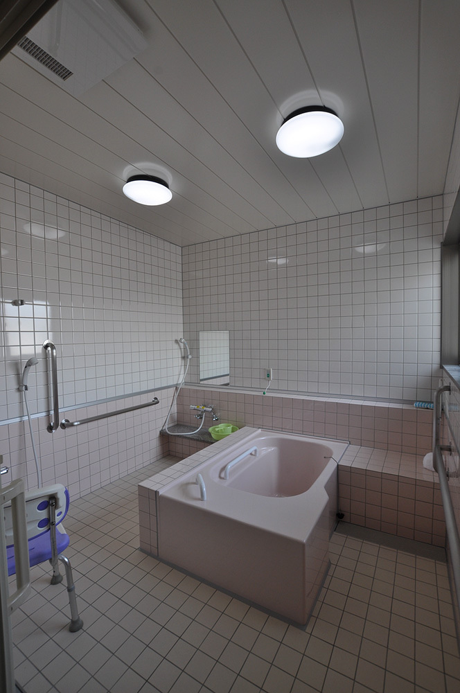 要介護度にもよりますが、ほとんどの入居者はお風呂にはいるには介助が必要なようです。限られた空間での効率性を考慮して一人用の浴槽に両側から介助できるようなレイアウトとなりました。また、浴槽はしっかり浸かれる深めのもので、ズリ落ちないように中に手すりが付いたものを採用。また、移乗から入るため、浴槽高さにあわせた移乗台を浴室の奥側に設置することになりました。しかし、実際はスタッフさんたちがいろいろな工夫をして使いやすいお風呂になっていくんだと思います。