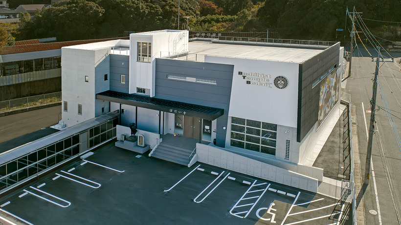 福岡市の油山の麓にある「菩提寺」の新本堂です。庫裏と納骨堂を併設した施設です。同朋会館建設から8年、庫裏の増築計画から始まり2年をかけて基本計画を重ね新しい本堂を建て替える計画となりました。