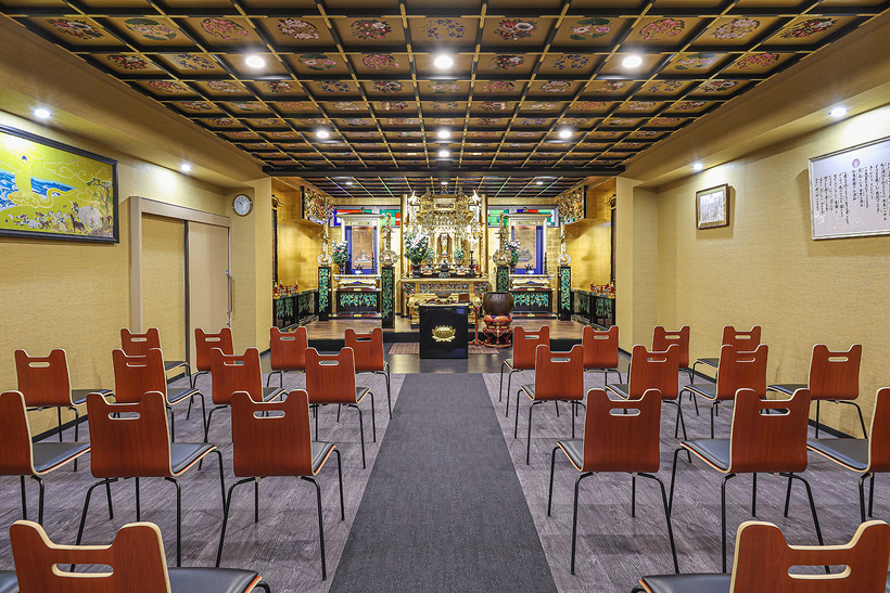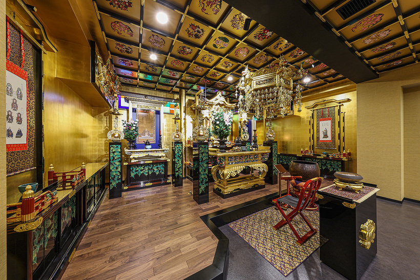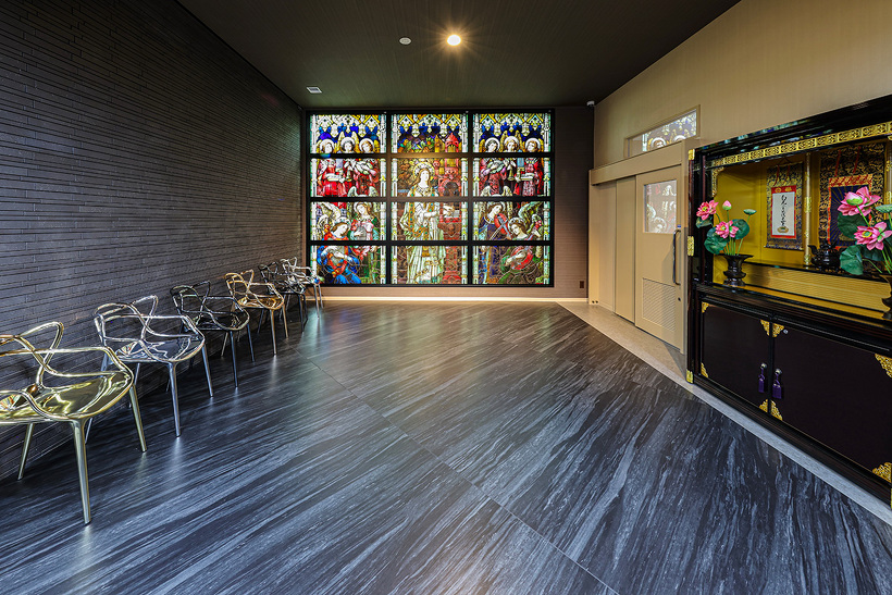 本堂の内陣には旧本堂からの移設された阿弥陀様と新調された仏具を配し、格天井と金箔の壁面を用いた寺院建築らしい設えとなっています。納骨堂のホールにはヨーロッパの教会から取り寄せた4m×3mのステンドグラス配され、参拝者を迎える神聖な空間となっています。