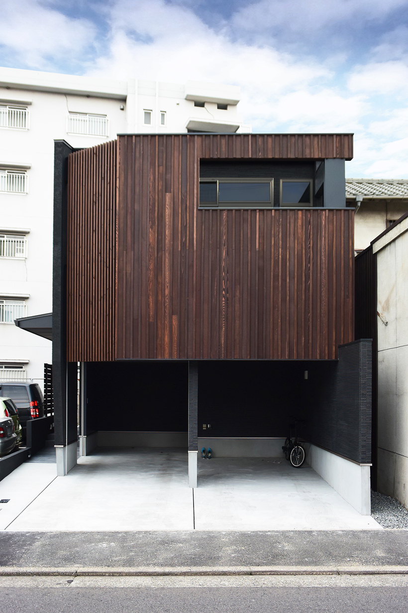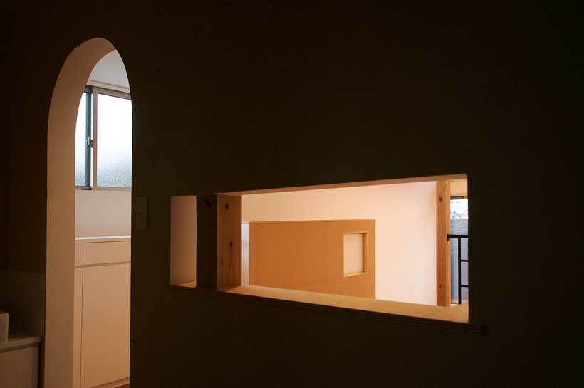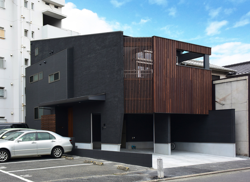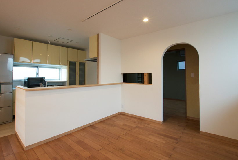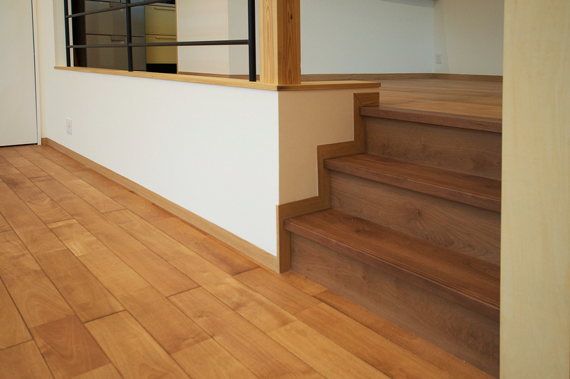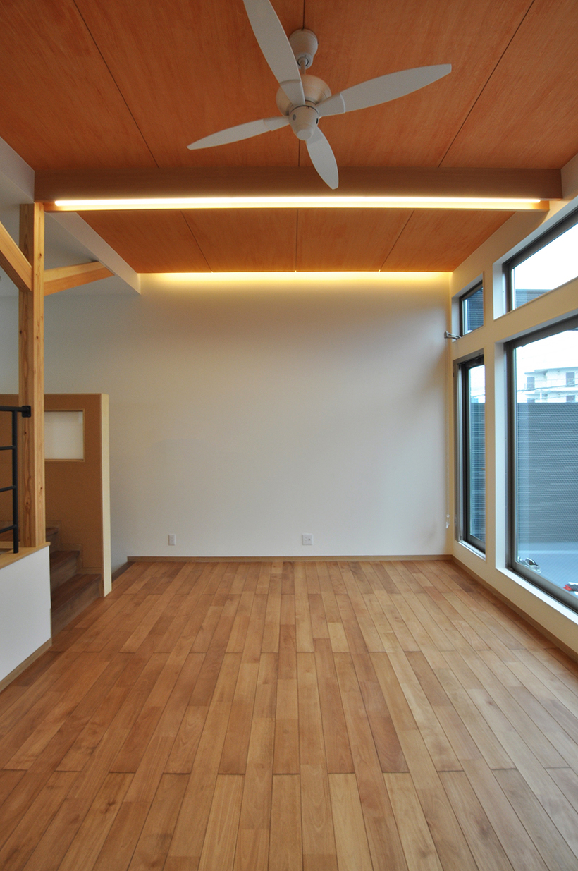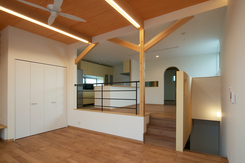 北九州で暮らすには車は必須だとよく言われていますが、この住宅も1階に2台分を確保するために半階分の高さのガレージを設け、その上部にリビングがのる構成。奥のエリアは普通の階高なのでその半階分の差があるスキップフロアになっています。リビングとダイニングは空間的には繋がっていますが床の高さが少し違うだけでエリア区分ができ機能的に使うことができます。