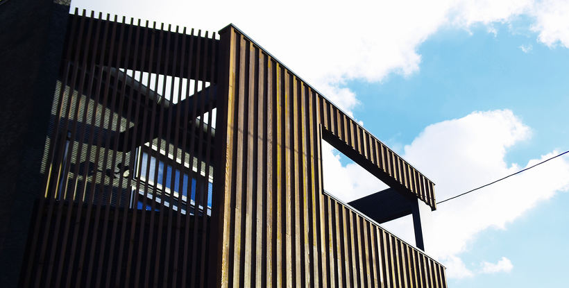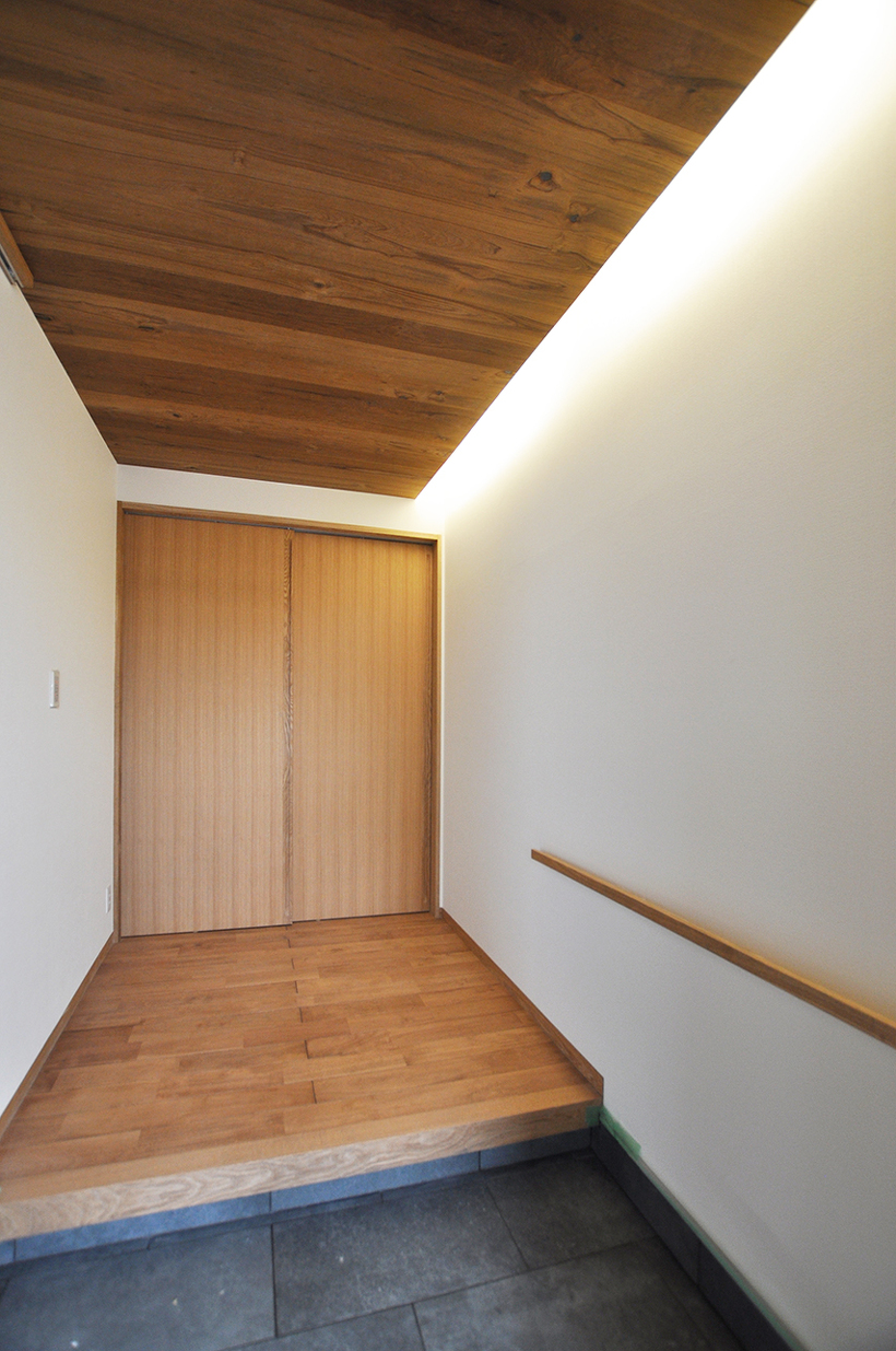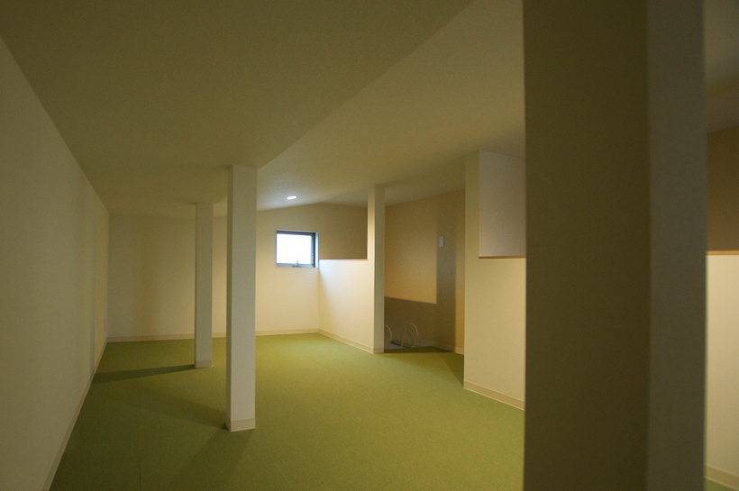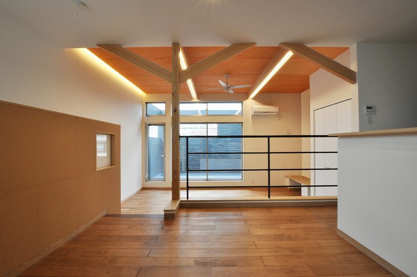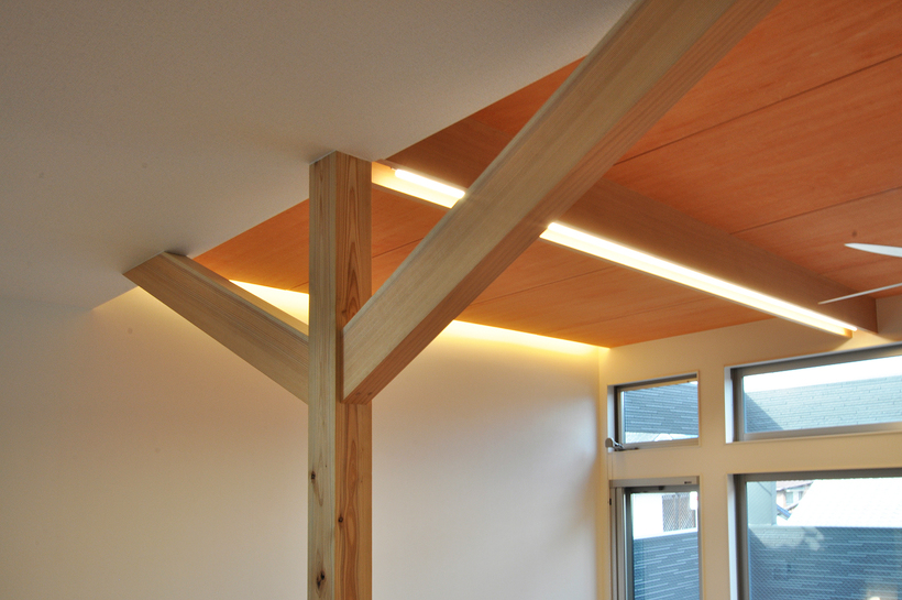 また木造の建物は柱を少なくすることが比較的難しいな構造です。今回は大きくスパンを飛ばすためと大梁を小さくするために中間の柱に方杖を設けてみました。垂直材と水平材とをつなぐ補強材で視覚的にもおもしろいし、筋交いとは違って空間をさえぎることが無いので「使える方法」な気がします。