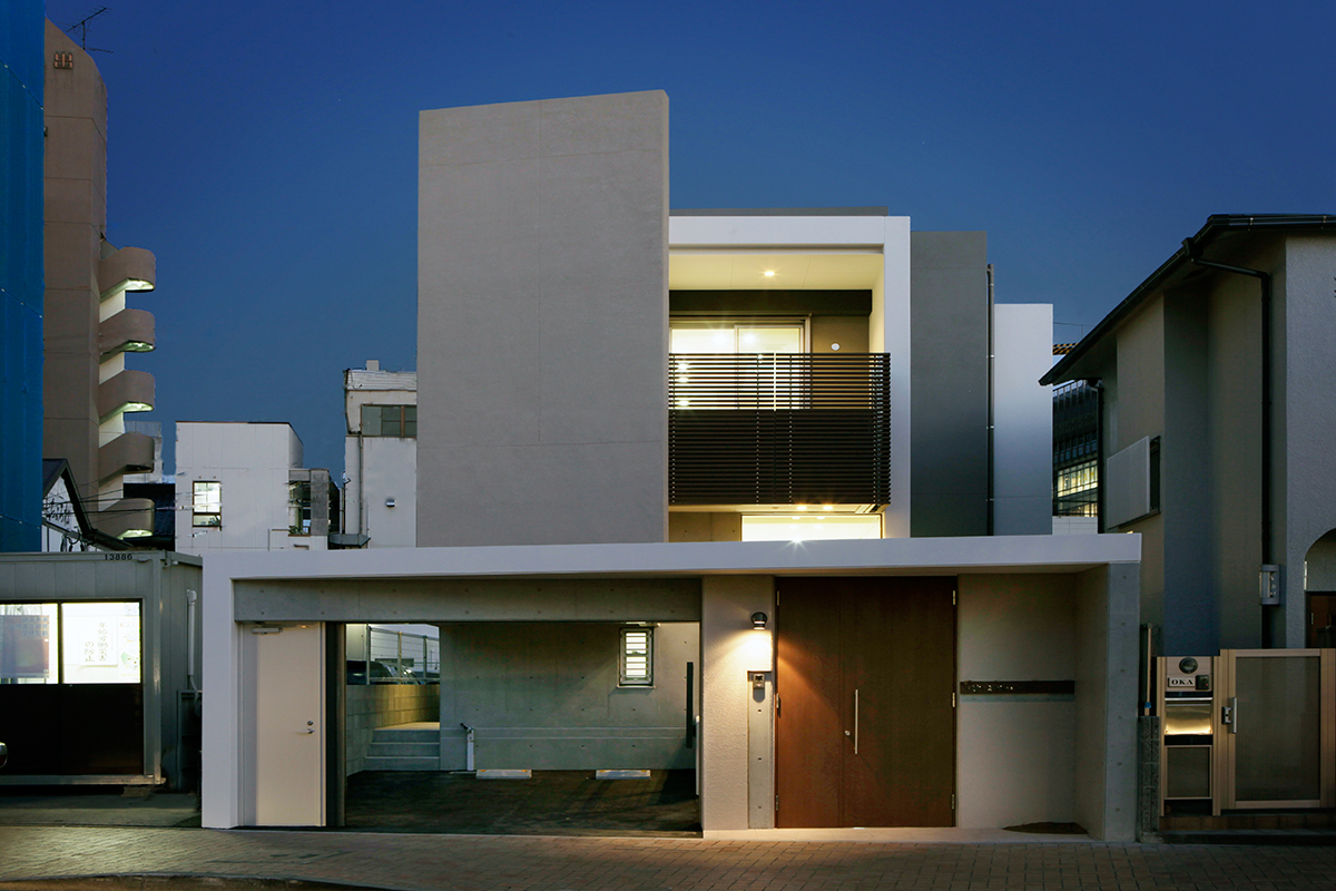 主な生活空間は2階に集中させ、1階はほぼゲスト用のスペースとなってます。石貼りの応接室は、南側のテラスに面していてとても明るい空間です。床を同じ高さにしているので内外一体利用もラクチンです。また、ここで料理教室をされるとのことで、格子戸の奥にはキッチンも配置されています。急なお客様でもすぐに隠せる3枚引戸、大活躍のようです。