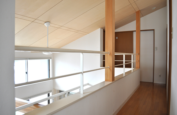 また、リビングは屋根の勾配を利用した、あまり高すぎずここちよい吹き抜けの空間となっています。上下のフロアを空間でつなぐことで、音や気配を感じることができます。吹き抜けに面した2階の廊下は、リビングとできるだけ一体となるように、スチールの手すりを取り付け開放的にしました。リビングのライティングダクトと統一感のあるデザインとしています。